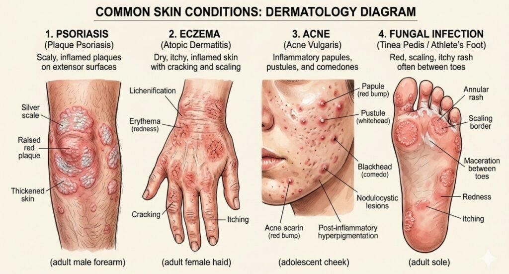 Common skin disorders such as psoriasis, eczema, acne, urticaria, fungal infections, and pigmentation disorders are now widely seen across all age groups.