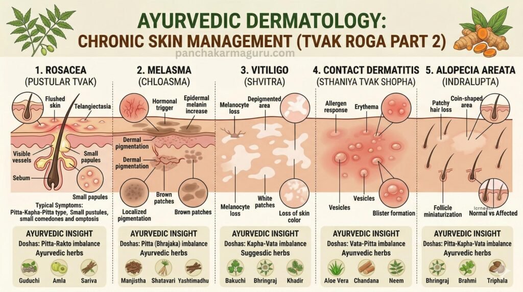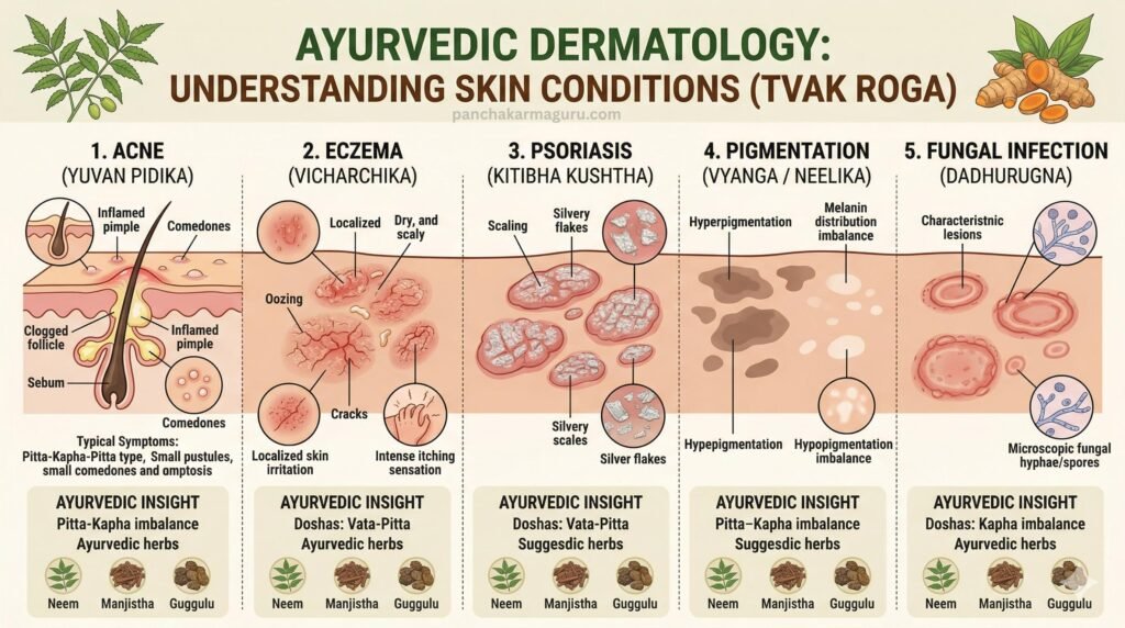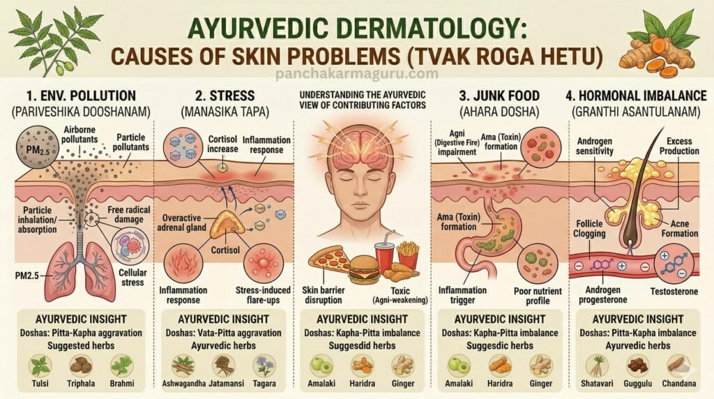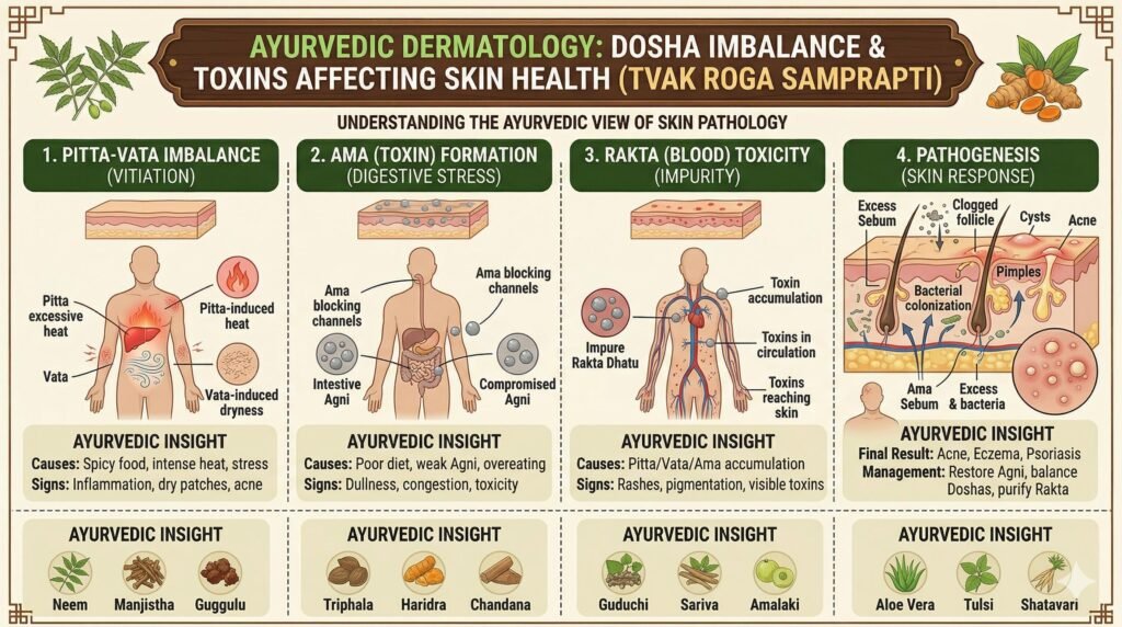 आयुर्वेद के अनुसार, त्वचा रोग केवल बाहरी समस्या नहीं है, बल्कि यह शरीर के अंदर मौजूद रक्त अशुद्धि (Rakta Dushti), पित्त असंतुलन और आम (toxins) का परिणाम है।