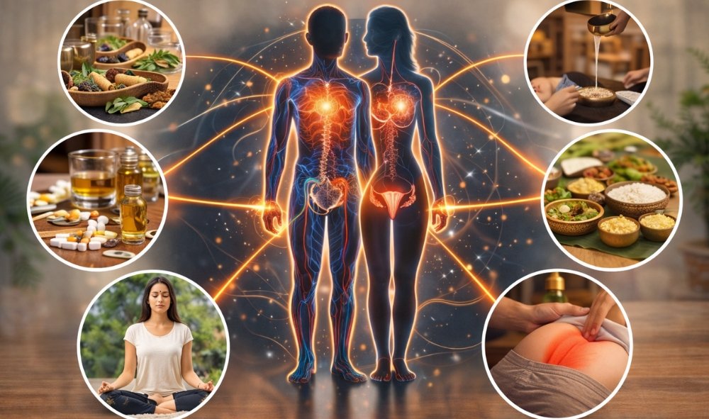 Ayurveda believes that healthy sexual life depends on balanced doshas (Vata, Pitta, Kapha), strong nervous system, proper hormonal function, and healthy reproductive tissues known as Shukra Dhatu.