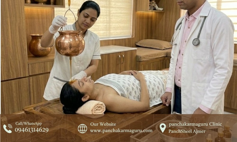 It involves rhythmic pouring of warm medicated oil over the forehead (Ajna region).