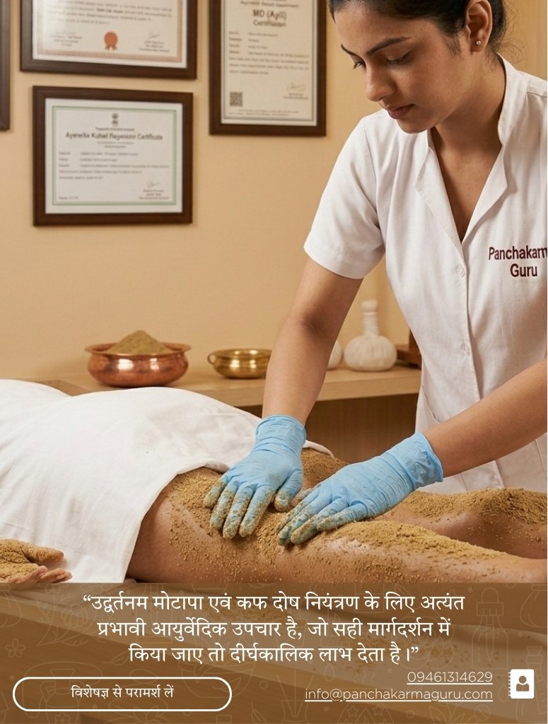 Udwarthanam is a classical Ayurvedic therapy performed using specially prepared herbal powders. The treatment focuses on breaking down excess fat tissues and improving lymphatic drainage.